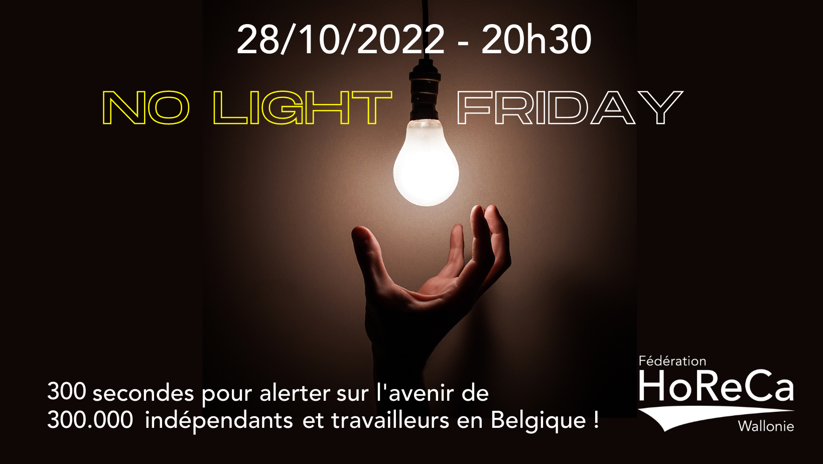 Nous invitons tous les propriétaires des établissements Horeca à éteindre les lumières le vendredi 28 octobre 2022, à 20h30, pendant 300 secondes, afin de sensibiliser leur clientèle à la situation du secteur, plombé notamment par l' envolée des prix de l'énergie".